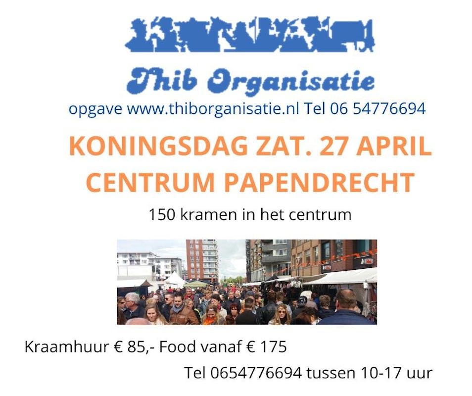 Koningsbraderie zaterdag 27 april in het centrum van Papendrecht. Wil je hier staan met nieuwe artikelen, geef je dan op via www.thiborganisatie.nl
