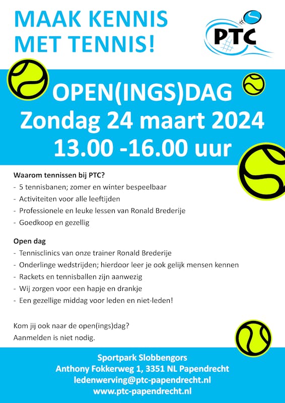 P.T.C. is een gezellige tennisclub, waar zowel recreatief als prestatief gespeeld kan worden! Wekelijks zijn er activiteiten voor alle le......