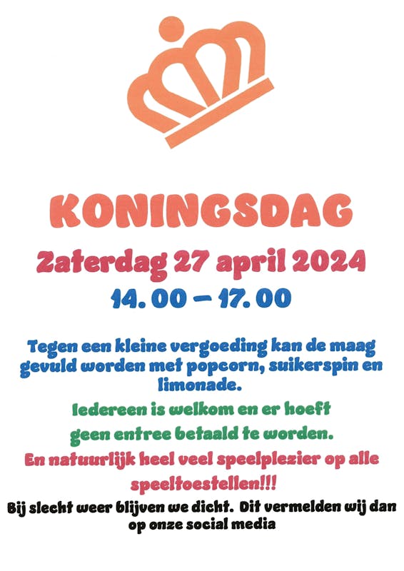 Op Koningsdag zijn wij open van 14.00 - 17.00!! Er kan gespeeld worden op onze speeltoestellen en tegen een kleine vergoeding kunnen de kinderen weer smullen van suikerspin en popcorn. Voor de ouders is er natuurlijk koffie en/of thee.