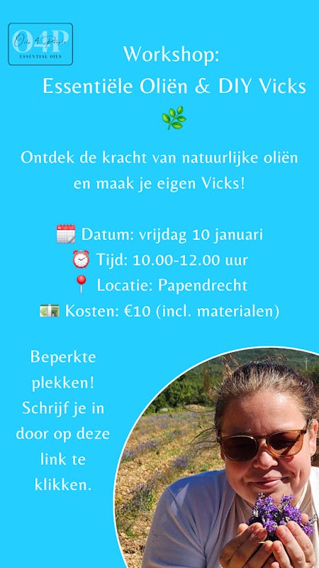Ben je nieuwsgierig naar essentiële oliën en wil je leren hoe je ze thuis kunt gebruiken? Doe mee met onze interactieve workshop, waar je alles leert over de werking van oliën en maak tijdens deze workshop ook een DIY om te zien hoe snel iets voor je kan werken.