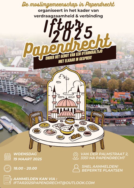 Op 19 maart organiseert de moslimgemeenschap in Papendrecht een Iftar-maaltijd. Een mooie gelegenheid om samen te komen, elkaar te ontmoeten en de verbinding in de buurt te versterken.