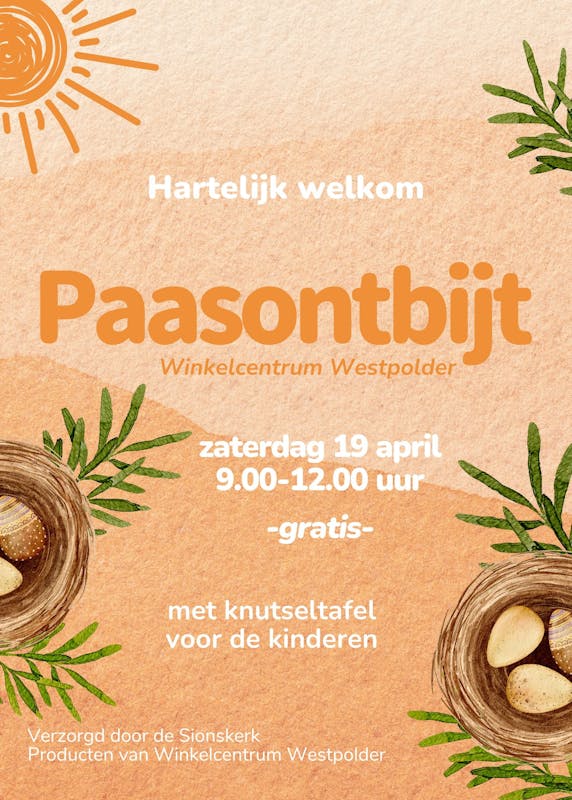 Kom op zaterdag 19 april voor een heerlijk Paasontbijt naar Winkelcentrum Westpolder! Van 9.00-12.00 uur kun je op het binnenplein aan tafel schuiven voor een gratis ontbijt. Voor de kinderen is er een knutseltafel.