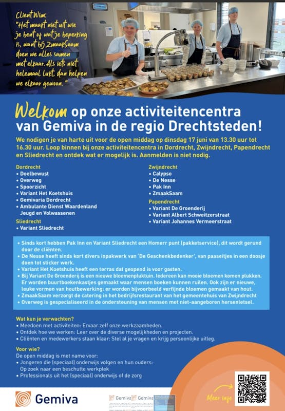 Op deze middag (17 juni) is er op alle activiteitencentra van Gemiva in de Drechtsteden een open middag!
