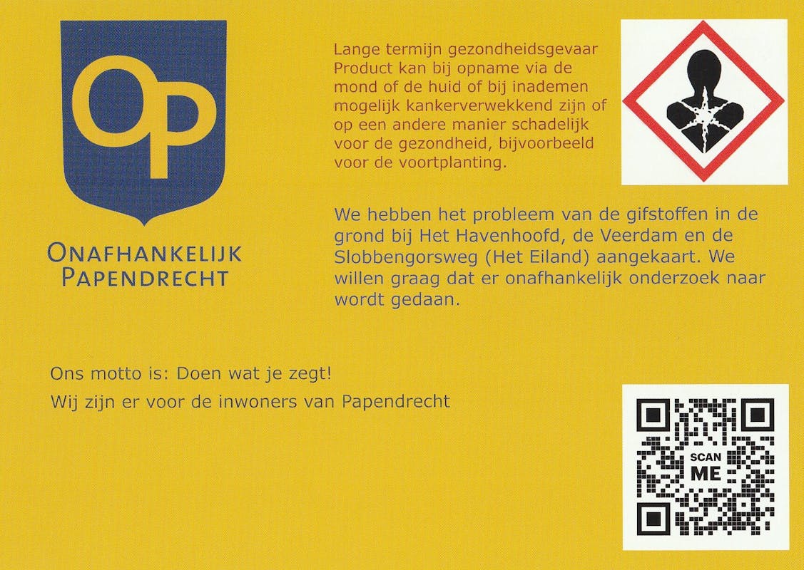 Vandaag gaan we flyeren bij Het Havenhoofd, de Veerdam en de Slobbengorsweg (het Eiland) om aandacht te vragen voor de problematiek van gifstoffen in de grond. Volgens ons horen die stoffen daar niet thuis en is er een onafhankelijk onderzoek nodig om vast te stellen hoe we hiermee om moeten gaan.