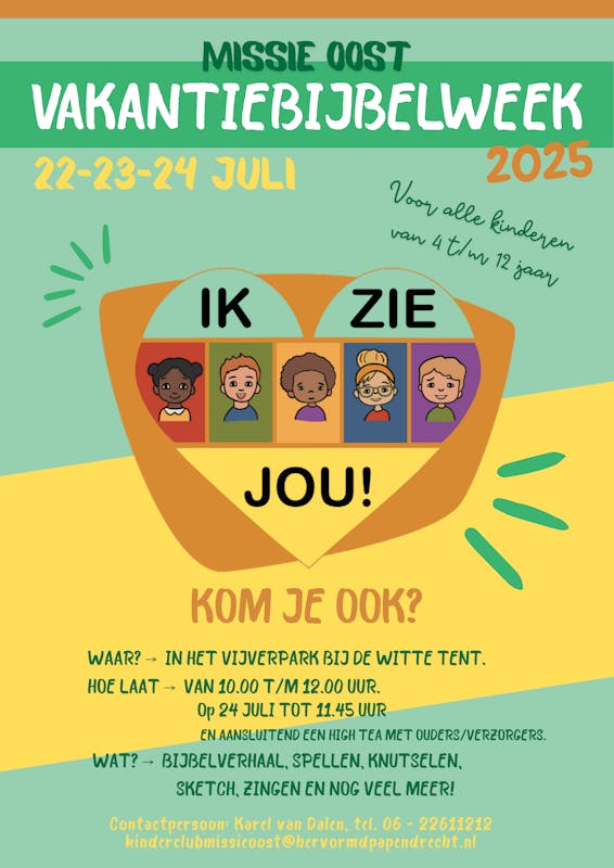 Het programma bestaat uit diverse spelletjes, leuke sketches, luisteren naar een bijbelverhaal, zingen, creatieve workshops en nog veel meer. Donderdag wordt de VBW afgesloten met een gezellige High Tea samen met de ouders. Het thema van dit jaar is: ‘Ik zie jou'. Kom je ook? Van harte welkom!