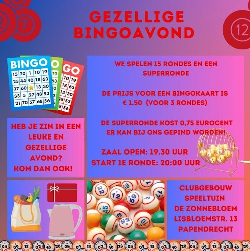 Op vrijdag 6 februari organiseert Speeltuin De Zonnebloem weer een gezellige bingoavond in het verenigingsgebouw aan de Lisbloemstraat in Papendrecht.