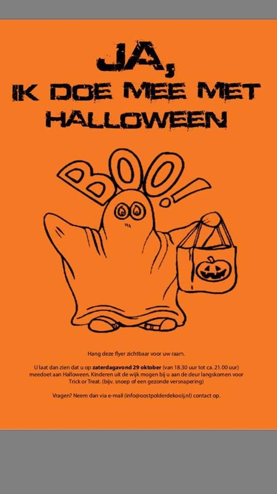 Op zaterdag 29 oktober vieren we weer Halloween in de wijk Oostpolder. Géén heel groots Halloween evenement zoals in 2013 en 2014 met Alvería de Heks en Woeste Willen in t Oostpolderpark, maar lekker in uw eigen buurt/wijk zodat iedereen zelf mee kan doen.