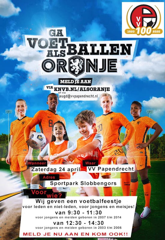Juist in deze coronatijd moeten jongeren bewegen en buiten bezig zijn. Bij Voetbalvereniging Papendrecht kan dat. Bij ons genieten meiden en jongens van veel voetbalplezier, samen met hun vriendjes en vriendinnetjes. Dit hebben we gedemonstreerd tijdens de succesvolle open dag van begin april. Binnenkort organiseert VV Papendrecht een tweede open dag voor de jeugd. In samenwerking met de voetbalbond vindt op zaterdag 24 april een uniek Oranjefestival plaats.