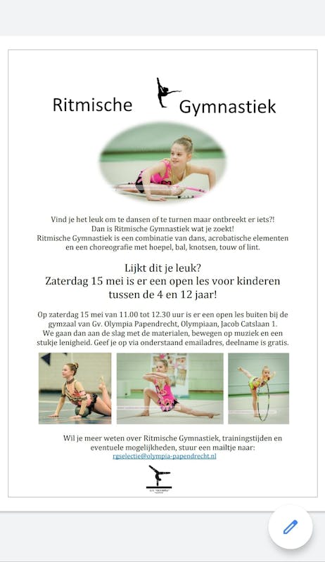 Op zaterdag 15 mei organiseren we een open les voor kinderen tussen de 4 en 12 jaar, waarbij je kennis kan maken met de materialen hoepel, bal, knots, lint en touw. We leren je een aantal bewegingen en technieken in combinatie met een dansvorm op muziek.