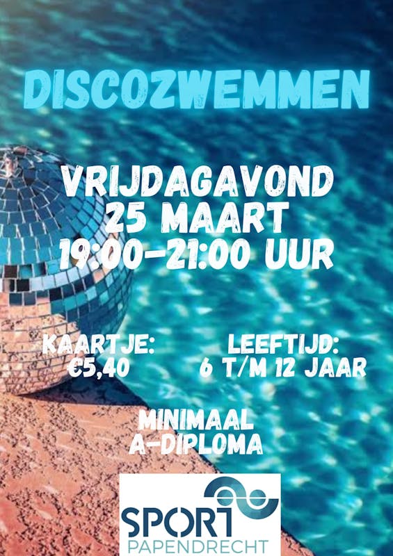 Vrijdagavond 25 maart van 19.00-21.00 uur is er Discozwemmen in het Doelgroepenbad van het Sportcentrum. Deze disco is bedoeld voor de jeugd 6 tot en met 12 jaar. In het bezit van minimaal een A-diploma.