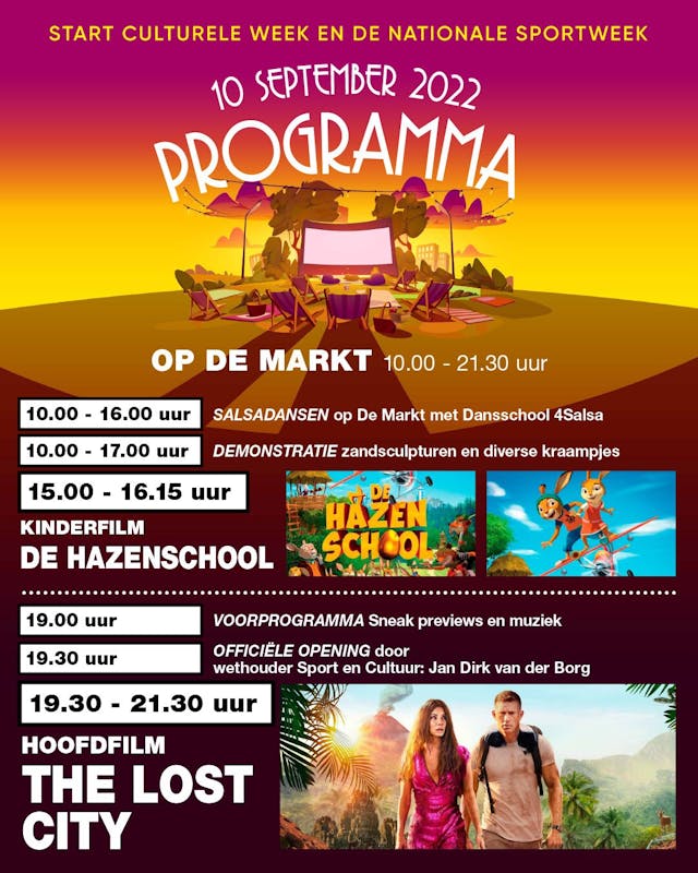 De gezamenlijke aftrap van de Culturele Week en de Nationale Sportweek vindt plaats op zaterdag 10 september om 15.00 uur op de Markt. Overdag zijn er activiteiten en in de middag en avond verandert het plein in een heuse openluchtbioscoop. Wethouder Jan Dirk van der Borg opent rond 19.00 uur het feestelijke avondprogramma.