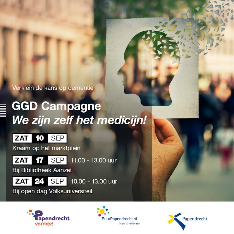 Op zaterdag 10 september, 17 september en 24 september is de GGD hard bezig met het promoten van hun campagne: We zijn zelf het medicijn! Verklein de kans op dementie en leer tijdens deze momenten meer over deze campagne