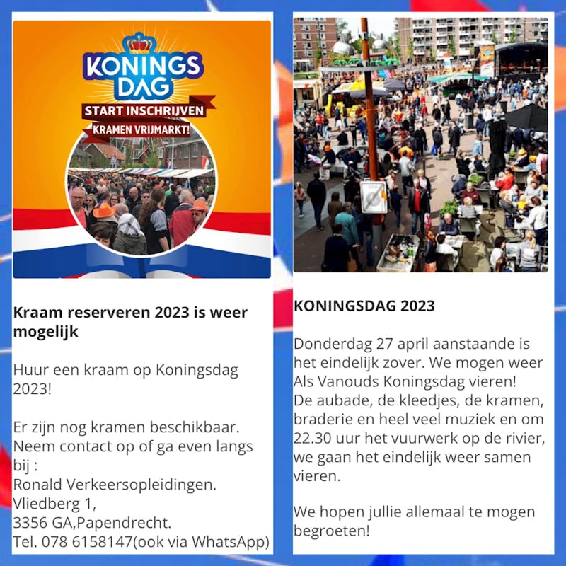 Donderdag 27 april 2023 is het weer tijd voor de jaarlijkse rommelmarkt op het Marktplein in Papendrecht.
