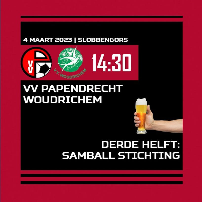 Dus kom op de eerste zaterdag van maart naar het Slobbengors om eerst Papendrecht naar een overwinning te juichen tegen Woudrichem om je daarna in het feestgedruis te storten dat verzorgd wordt door Samball Stichting.