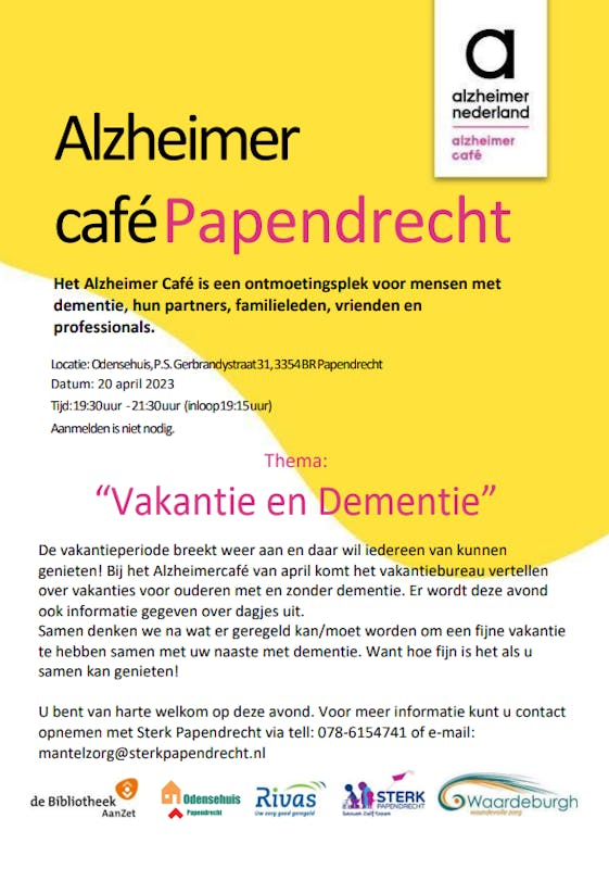 De vakantieperiode breekt weer aan en daar wil iedereen van kunnen genieten! Bij het Alzheimercafé van april komt het vakantiebureau vertellen over vakanties voor ouderen met en zonder dementie. Er wordt deze avond ook informatie gegeven over dagjes uit. Samen denken we na wat er geregeld kan/moet worden om een fijne vakantie te hebben samen met uw naaste met dementie. Want hoe fijn is het als u samen kan genieten! U bent van harte welkom op deze avond.