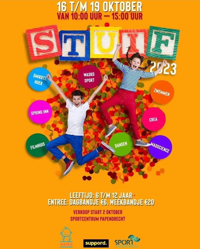 Stuif komt er weer aan! Het Sportcentrum Papendrecht, Wasko & Suppord organiseren weer in de herfstvakantie de Stuif voor alle kinderen van 6 t/m 12 jaar uit Papendrecht.