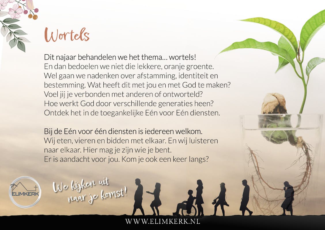 Dit najaar behandelen we het thema… wortels! En dan bedoelen we niet die lekkere, oranje groente. Wel gaan we nadenken over afstamming, identiteit en bestemming. Wat heeft dit met jou en met God te maken? Voel jij je verbonden met anderen of ontworteld? Hoe werkt God door verschillende generaties heen? Ontdek het in de toegankelijke Eén voor Eén diensten.