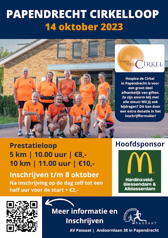 Op zaterdag 14 oktober organiseert AV Passaat alweer voor de 3e keer de Papendrecht Cirkelloop. Bij deze loop (over 5 km. of 10 km.) zamelen we geld in voor Hospice De Cirkel in Papendrecht.