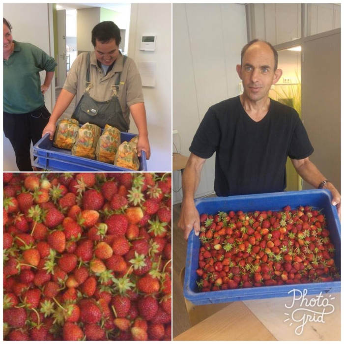 De eerste aardbeien zijn geplukt, uit de tuin bij de Groenderij.