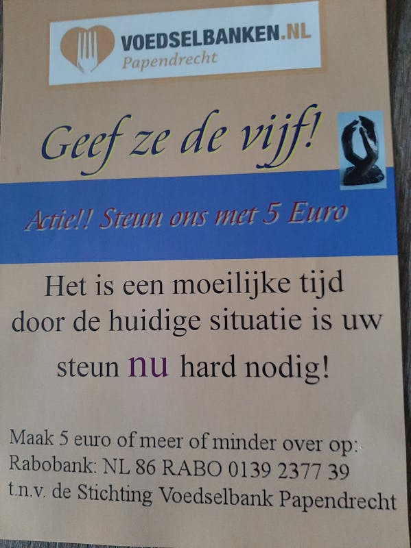 Deze coronacrisis is ook een moeilijke tijd voor de voedselbanken, dus ook voor de Voedselbank Papendrecht in de Coornhertstraat. Met man en macht tracht men deze open te houden. Belangrijk voor de ruim 120 huishoudens met totaal zo'n 300 personen. Volwassenen en kinderen. Wekelijks moet er gezorgd worden voor een goed en verantwoord pakket voor elk gezin. Houdbare maar ook verse producten en fruit. Tot nu toe lukt dat nog steeds maar producten nemen af en kosten toe. Ook moet er nu meer worden ingekocht. Ook in deze tijd kosten voor extra hygiene en desinfectering. Dus steun ze met uw gift. Vijf euro. Minder of meer mag ook.