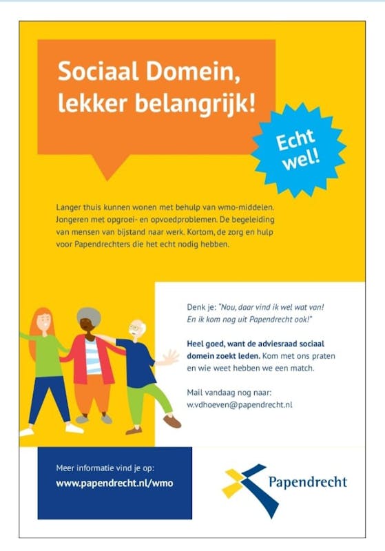 Per 1 juli 2024 is de Wmo - adviesraad overgegaan in Adviesraad Sociaal Domein Papendrecht. Dit betekend o.a. dat de Raad gevraagd en ongevraagd advies mag geven aan het College van Burgemeester en Wethouders over Wmo, Participatiewet en Jeugd. Hiervoor zijn we op zoek naar nieuwe leden die onze huidige raad gaan bijstaan.