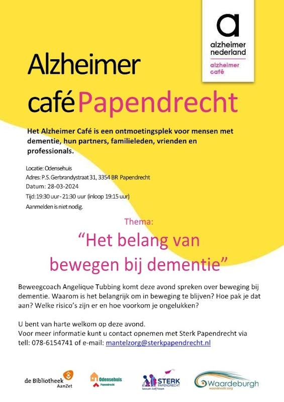 Beweegcoach Angelique Tubbing komt deze avond spreken over beweging bij dementie. Waarom is het belangrijk om in beweging te blijven? Hoe pak je dat aan?Welke risico's zijn er en hoe voorkom je ongelukken?