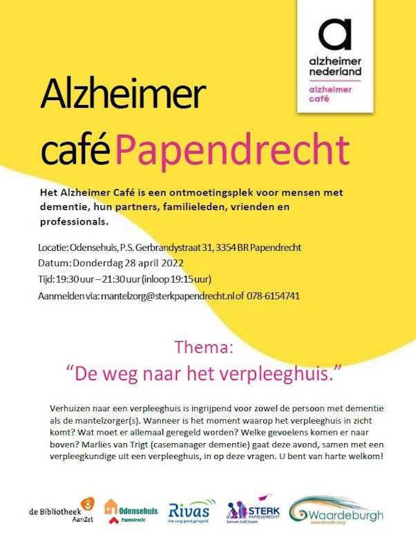 Verhuizen naar een verpleeghuis is ingrijpend voor zowel de persoon met dementie als de mantelzorger(s). Wanneer is het moment waarop het verpleeghuis in zicht komt? Wat moet er allemaal geregeld worden? Welke gevoelens komen er naar boven? Marlies van Trigt (casemanager dementie) gaat deze avond, samen met een verpleegkundige uit een verpleeghuis, in op deze vragen. U bent van harte welkom!
