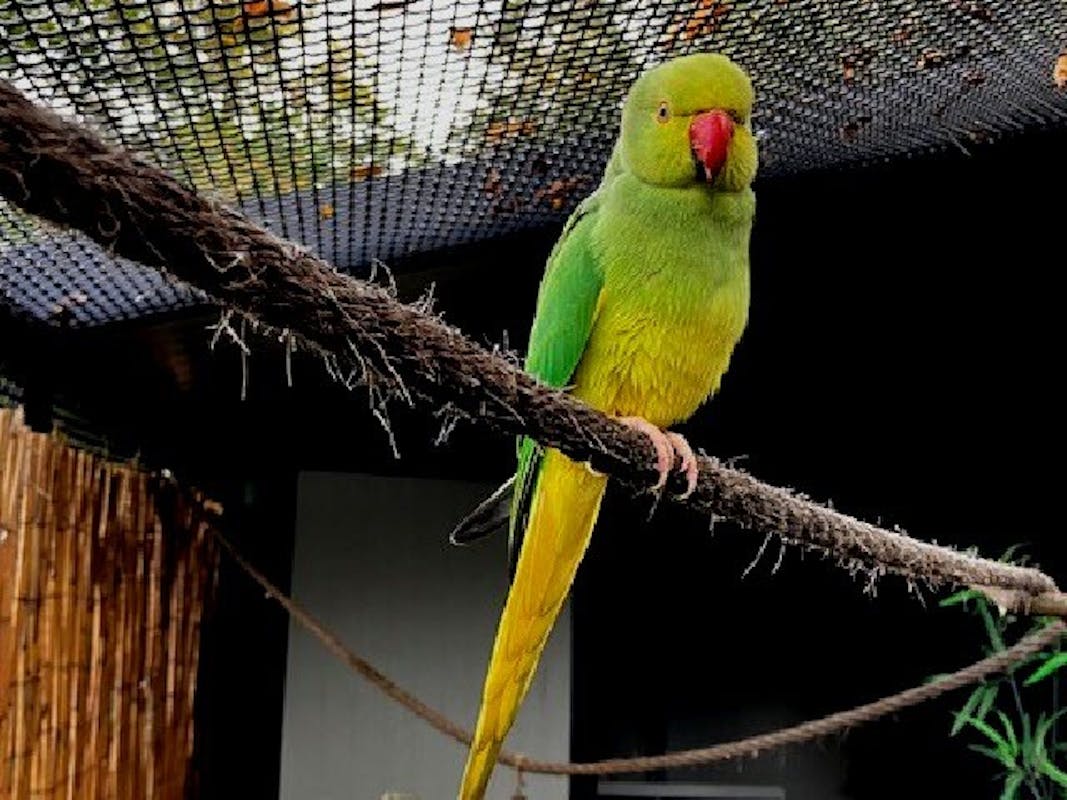 Dit is Trompie een halsbandparkiet. Trompie is als zwerver bij ons binnen gekomen. Inmiddels verblijft hij al bijna 1,5 jaar in onze grote volière buiten. Hij is tegenover mensen onwijs vrolijk en vriendelijk.Hij zit ook heel graag bij je op de schouder >>>>
