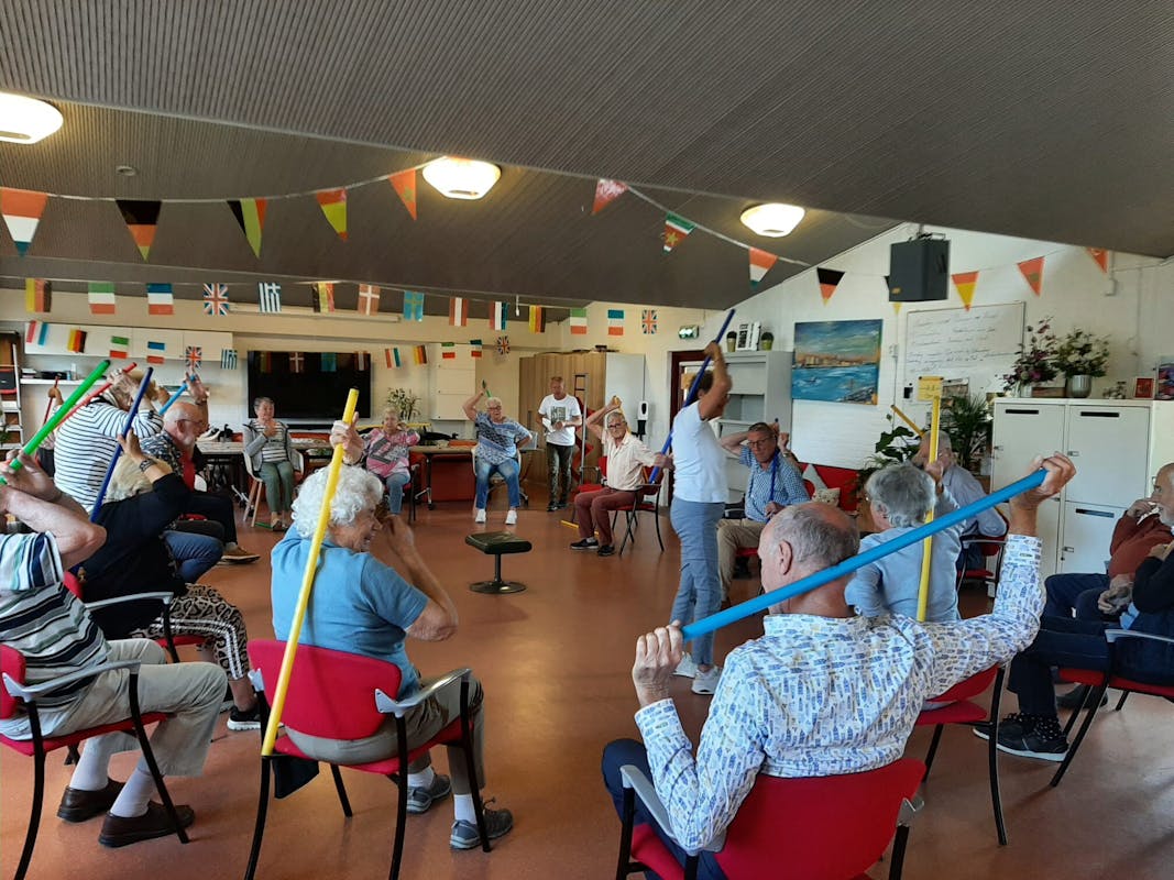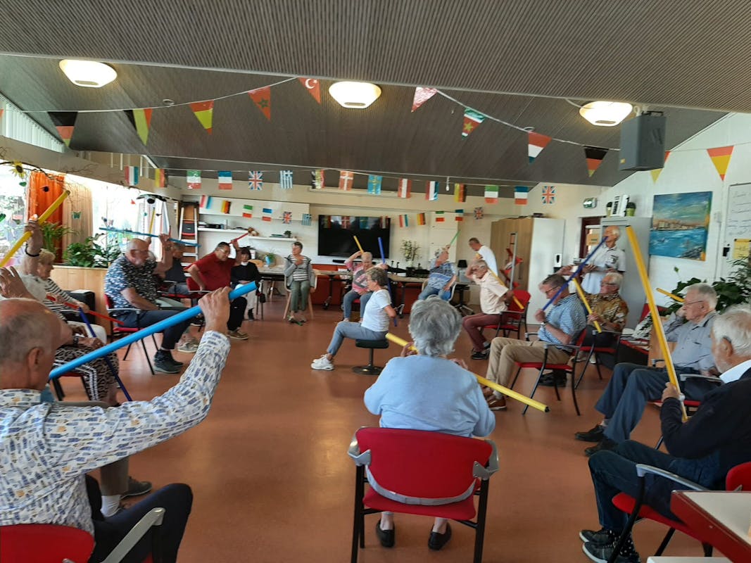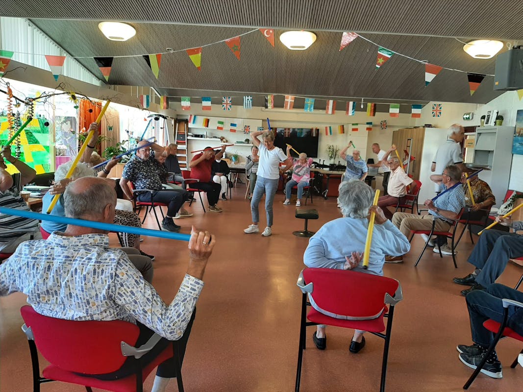 Iedere maandag ochtend komen Sonja en Leo om samen met de bezoekers te bewegen en zoals je ziet iedereen doet mee.