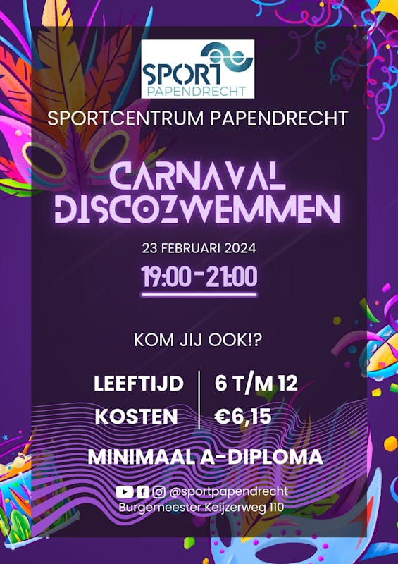 Vrijdagavond 26 januari 2024 van 19.00-21.00 uur is er discozwemmen in het Doelgroepenbad van Sportcentrum Papendrecht. Deze disco is bedoeld voor de jeugd van 6 t/m 12 jaar, ...