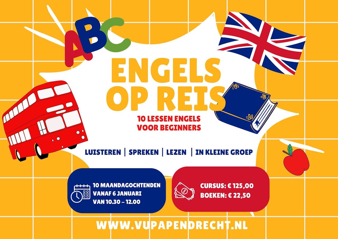 Wie geen kennis heeft van de Engelse taal, maar wel merkt het tijdens het reizen steeds vaker nodig te hebben, kan nu bij Volksuniversiteit Papendrecht op de maandagochtenden vanaf 6 januari in 10 lessen de beginselen van het Engels leren.