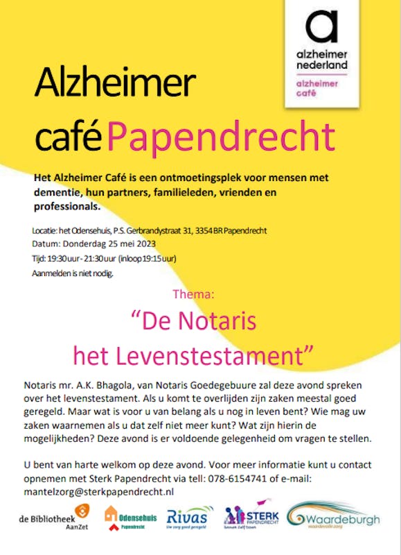 Notaris mr. A.K. Bhagola, van Notaris Goedegebuure zal deze avond spreken over het levenstestament. Als u komt te overlijden zijn zaken meestal goed geregeld. Maar wat is voor u van belang als u nog in leven bent? Wie mag uw zaken waarnemen als u dat zelf niet meer kunt? Wat zijn hierin de mogelijkheden? Deze avond is er voldoende gelegenheid om vragen te stellen.