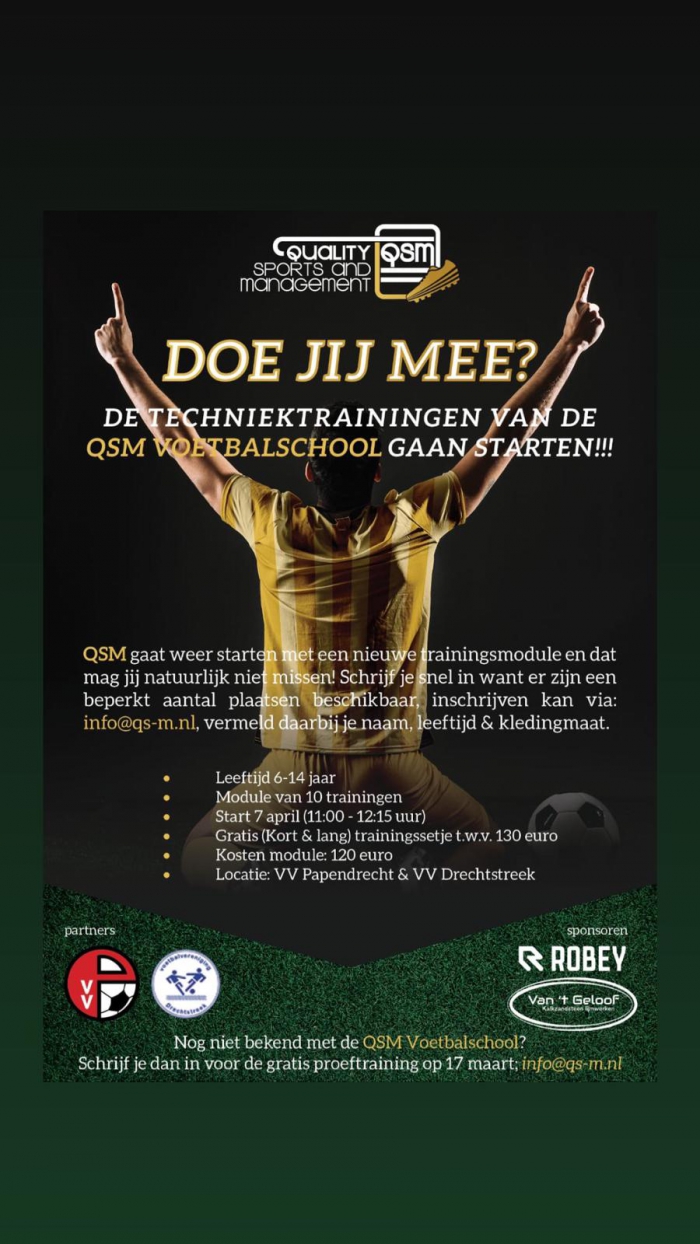 Op 7 April zal de QSM voetbalschool weer van start gaan. Kinderen tussen 6-14 jaar kunnen deelnemen aan een 10 delige trainingsmodule.