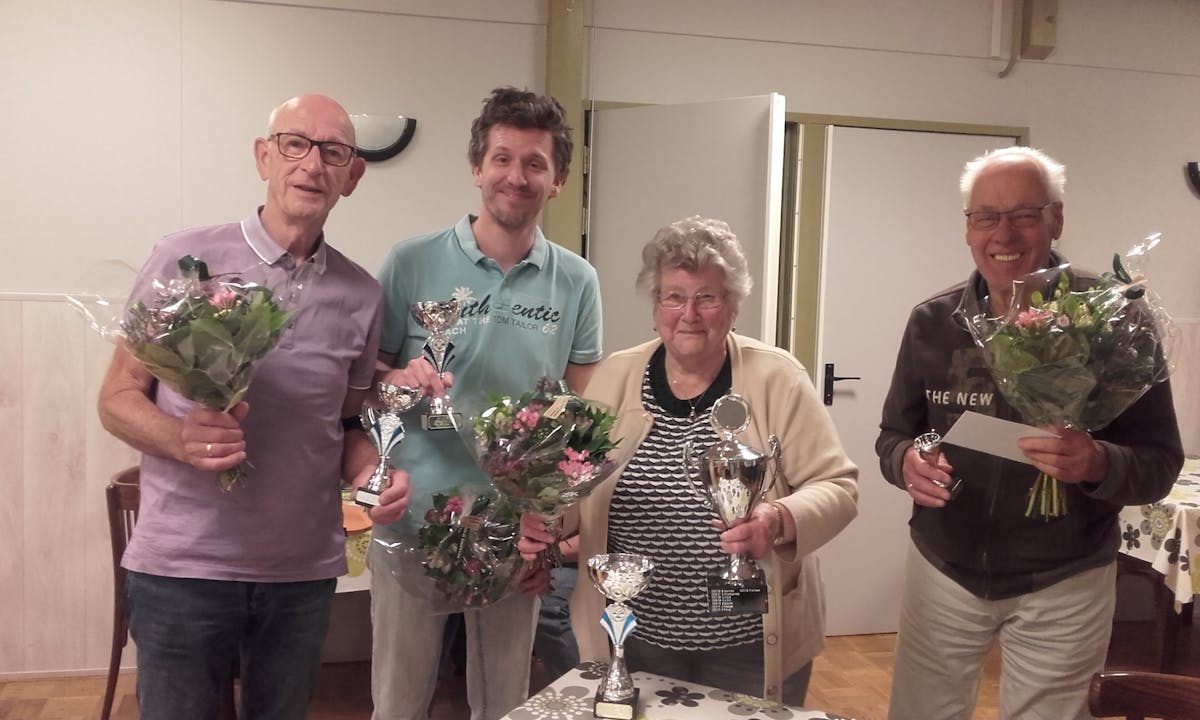 v.l.n.r. 3e prijs dHr Corvers, 2e prijs dHr Van Bemmel, 1e prijs mw Versendaal en poedelprijs dHrVan Beek