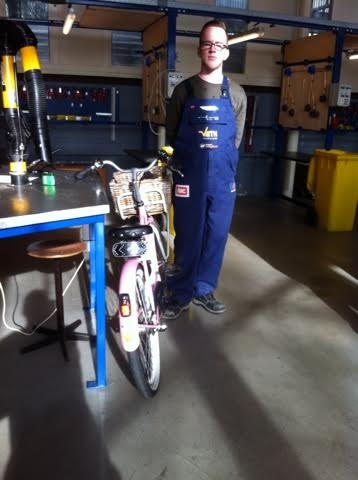 Toen Djosh Schevers, een zeer gemotiveerde 4e jaars leerling elektrotechniek met veel elektronica-ervaring, dit van zijn docent hoorde stond hij te popelen om hiermee aan de slag te gaan. Het is Djosh gelukt om het systeem aan te passen. Met speciaal gemaakte metalen beugels is het geheel netjes op de fiets gemonteerd. En straks in het voorjaar kan Emma veilig naar school fietsen !