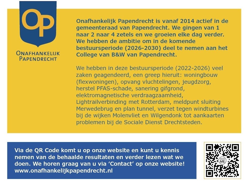 Papendrecht verdient een bestuur dat luistert, dat handelt en dat samen met u bouwt aan de toekomst. Onafhankelijk Papendrecht staat voor openheid, duurzaamheid en betrokkenheid. Wij zetten ons in voor een gezonde leefomgeving, betaalbare woningen en veilige buurten. Ondernemers krijgen bij ons de ruimte om te groeien, en inwoners worden actief betrokken bij beslissingen die hun dagelijks leven raken. Samen zorgen we voor een gemeente waarin iedere stem telt en waarin we trots kunnen zijn op onze gemeenschap. Onafhankelijk Papendrecht: voor een veerkrachtig Papendrecht, klaar voor de toekomst.