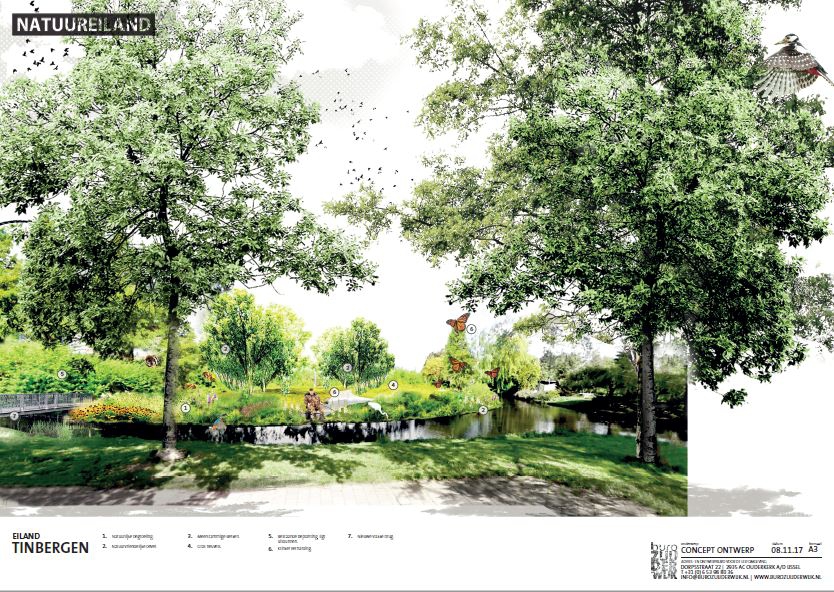 Het is alweer bijna twee jaar geleden dat een bewonersavond is georganiseerd waar belangstellenden hun grote voorkeur uitspraken voor een natuurvriendelijke inrichting van het eilandje. De voetbrug tussen de woningen van het Tinbergenplantsoen is vervallen. Er zijn ruim 20 bomen geplant. Een gedeelte van de oevers is natuurvriendelijk ingericht en er zijn zaden van wilde planten uitgezaaid. Er is geen verlichting meer op het eilandje. In overleg met de bewonerswerkgroep is het straatmeubilair uitgezocht en voor de vele vogels is gezorgd voor goede huisvesting.