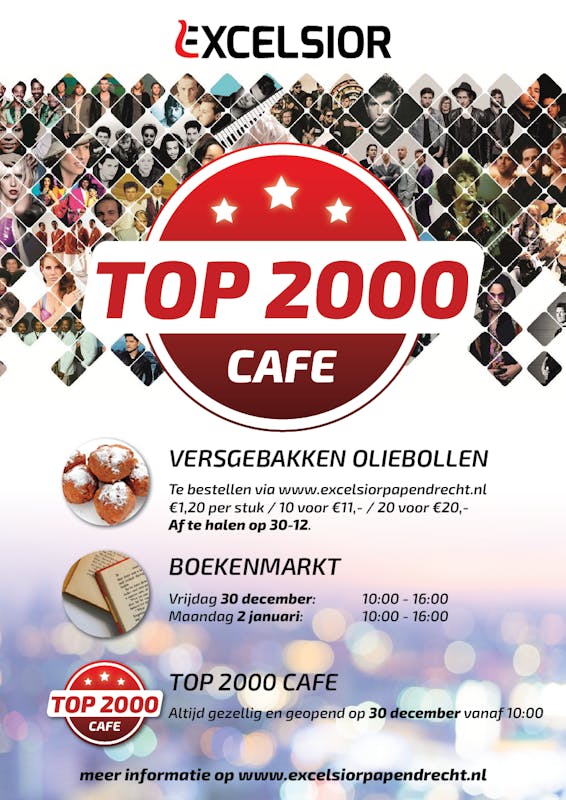 30 december organiseert Excelsior voor het 5e jaar op rij het TOP2000 café in haar verenigingsgebouw. Tussen 10:00 en 16:00 uur kunt in de bar terecht voor een drankje en een versgebakken oliebol. Ook is er op groot scherm een livestream van de TOP2000 van Radio 2. Via www.excelsiorpapendrecht.nl/oliebollen kunt u oliebollen bestellen. Pinnen is mogelijk en afhalen kan op 30 december tussen 10:00 en 16:00 uur. De oliebollen kosten € 1,20 per stuk, 10 stuks voor € 11,- en 20 stuks voor € 20,-.