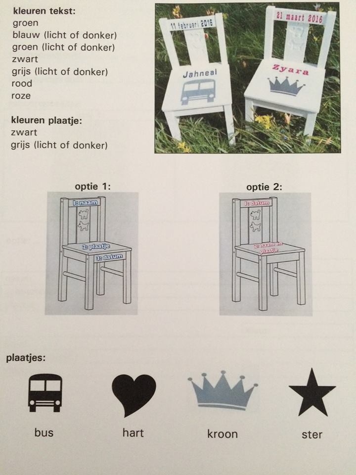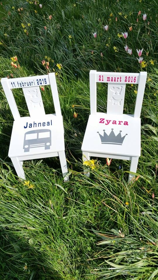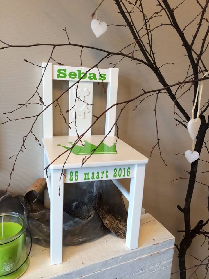 Te bestellen bij Fideel, deze leuke geboortestoeltjes. Ze kosten €22,50 en de indeling, plaatje en kleur kunt u zelf bepalen!