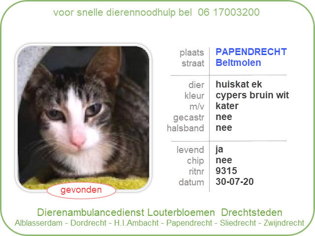 PAPENDRECHT, Josef Israelstraat Kat ek (v) gevonden, Is in slechte conditie. Naar dierenarts gebracht. Ongechipt, zwarte halsband met belmagneet, Dossier 6503 / 181125