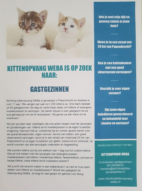 Het kittenseizoen is nu echt los gebarsten. De afgelopen week zijn er 17 kittens bij ons binnengekomen. Een aantal gelukkig met hun mama erbij. Drie moeders met kittens zijn af...
