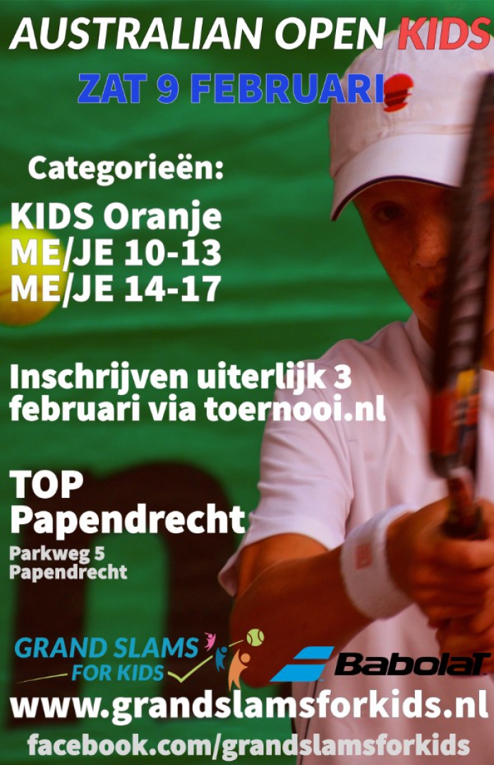 De Australian Open KIDS 2019 vindt op zaterdag 9 februari plaats bij Tennisvereniging TOP in Papendrecht. Dit is een eendaags toernooi die in de hal van TOP gespeeld zal worden. De categorieën waarin gespeeld wordt zijn: