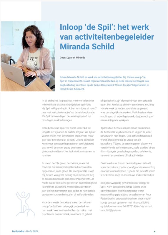 Deze keer in 'De opsteker' het blad van Yulius: het werk van activiteitenbegeleider Miranda.