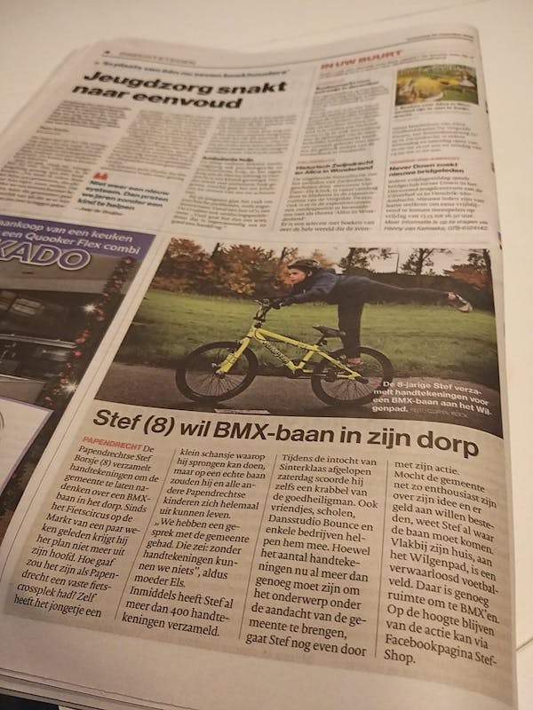 Stef is bezig om de gemeente van Papendrecht te overtuigen dat een bmx-baan in Papendrecht een heel goed idee is. Dat ze dan heel veel kinderen in de leeftijd 10 tot 16 jaar wel naar buiten krijgen om te 'spelen' . Gisteren hoorde we dat er in Papendrecht erg weinig buiten word gespeeld door de kinderen. Daar moet toch verandering in komen!