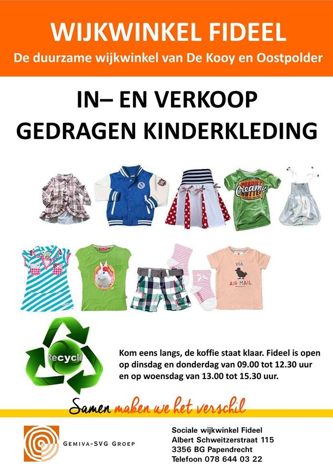 Sociale wijkwinkel Fideel verzorgt in- en verkoop van gedragen kinderkleding. Wij nemen kinderkleding in tot en met maat 140. De opbrengst van de kleding is 50/50, de helft van de opbrengst is u en de andere helft voor stichting Gemiva-SVG Groep.