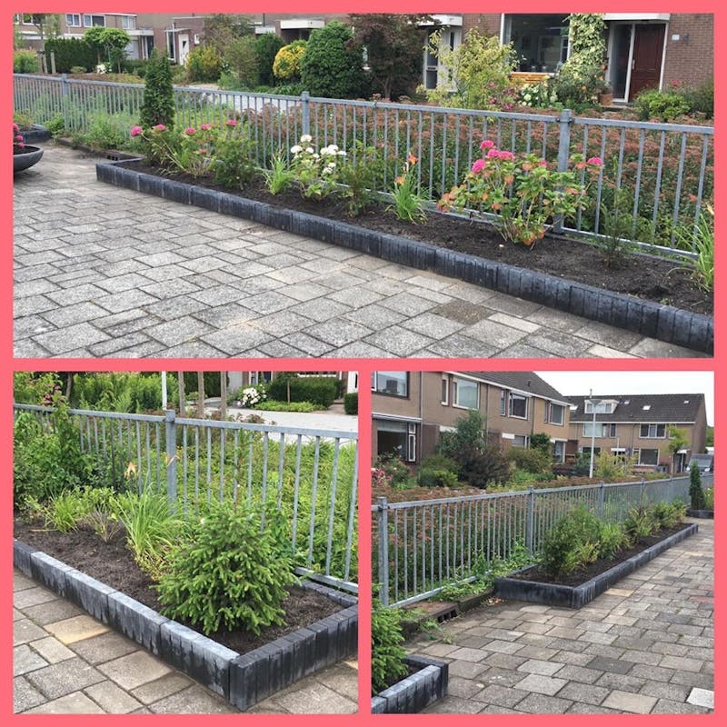 Wij wilde graag groen terug en hebben bakken laten maken langs het hek aan de achterzijde. Met hulp van Gerrit een cliënt van de Groenderij zijn er allerlei planten ingezet vanuit de tuin van de Groenderij en planten die we gekregen hebben.