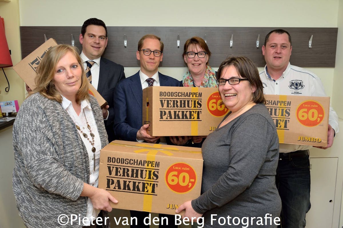Weggeefhoek Papendrecht deelt 46 Jumbo verhuispakketten uit Papendrecht - Weggeefhoek Papendrecht deelde vrijdagavond 46 Jumbo Verhuispakketten uit. Initiatiefnemers Wilma Erkelens, Simone Rietveld en Wilco de Keijzer reikten de pakketten samen met wethouder Jan Nathan Rozendaal en Dennis Wijnveldt, bedrijfsleider van de Jumbo, uit in de woonkamer van Bij Bosshardt aan de Staringlaan. De pakketten zijn zegel voor zegel ingezameld door de leden van Weggeefhoek Papendrecht en inwoners van Papendrecht. In totaal zijn er bijna 2800 zegels ingezameld, wat resulteert in 46 pakketten ter waarde van 60 euro per pakket. “De brievenbus klepperde met grote regelmaat, en er waren heel wat avonden dat we met meerdere personen onderweg waren om de zegels thuis bij de mensen op te halen”, vertellen Marty Wessels en Wilco de Keijzer, beheerders van Weggeefhoek Papendrecht. De prijswinnaars zijn vooral opgegeven door leden van de Weggeefhoek Papendrecht en een enkeling heeft zichzelf opgegeven. De Weggeefhoek noemt de 48 ontvangers van de pakketten prijswinnaars. “Onze winnaars zijn mensen die de moed niet opgeven door bijvoorbeeld ziekte of werkloosheid. Ze zetten juist door en helpen vaak zelfs nog anderen. Dat maakt hen echte winnaars!”