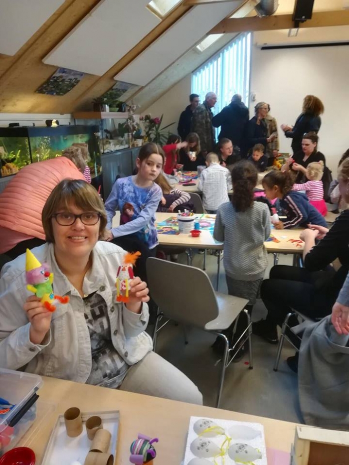 Het was volle bak bij de knutselmiddag op de kinderboerderij bij De Papenhoeve. Marian hielp de kinderen met eieren beschilderen, eieren omtoveren tot kippen en clowntjes maken van..... eieren. Zou het bijna Pasen zijn?