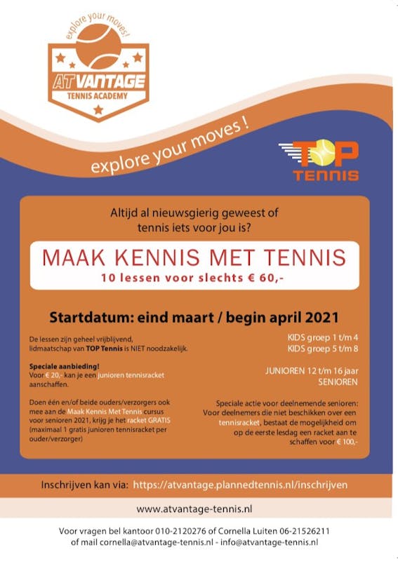Voor vragen bel At Vantage Tennis Academy op telefoonnummer 010-2120276 of Cornella Luiten 06-21526211 of mail