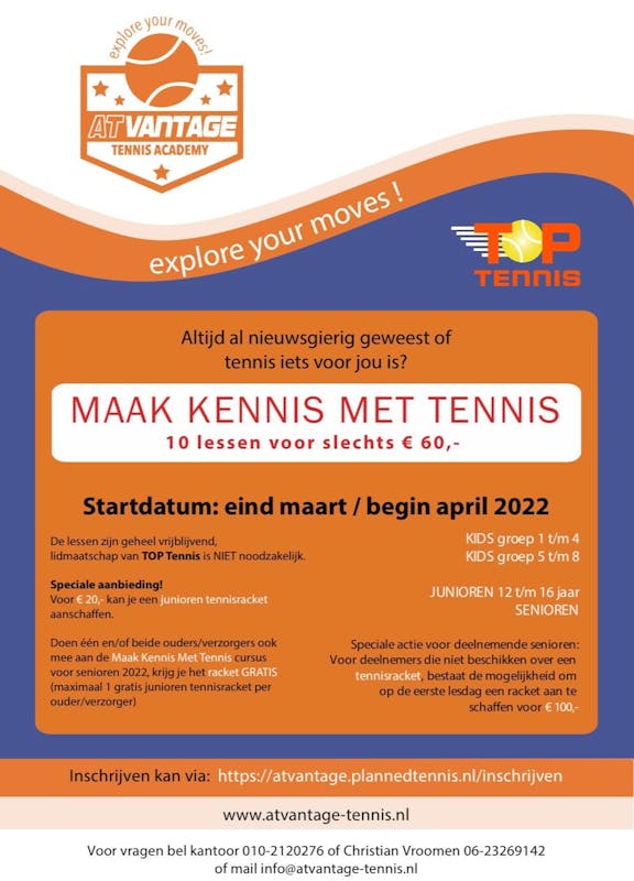 Voor vragen bel At Vantage Tennis Academy op telefoonnummer 010-2120276 of Christian Vroomen 06-23269142 of mail naar